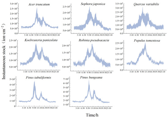 The daytime instantaneous current value was significantly higher than the nighttime value for all the species of trees, and the change was relatively smooth at night. The nighttime instantaneous current value for the broadleaf species fluctuated between 6.30 × 103~7.67 × 103 ion·cm−2 and 8.68 × 103~16.32 × 103 ion·cm−2 for the conifers. There were significant inter-species differences in the instantaneous stock, with a lag in the peaks of Robinia pseudoacacia and Populus tomentosa. The instantaneous stock reached its highest daytime value at 12:00 (19.54 × 103 ± 1.74 × 103 ion·cm−2 and 22.76 × 103 ± 2.30 × 103 ion·cm−2, respectively). The daytime low occurred at 10:30 (12.92 × 103 ± 1.32 × 103 ion·cm−2). The rest of the species reached their first peak at 10:00 and the trough at 13:00. Quercus variabilis had the highest instantaneous existing stock at the time of release. The peaks and troughs were 23.67 × 103 ± 8.52 × 103 ion·cm−2 and 14.35 × 103 ± 5.80 × 103 ion·cm−2, respectively. The conifers had significantly higher rates of increase than the broadleaf species, and the rate of increase was consistent with the rate of release. As shown in Table 6, the instantaneous existing stocks were not necessarily high for species with fast rates of increase.