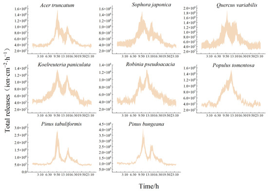 As shown in Figure 7, the daily trend of the total number of NAIs released hour−1 by each species of tree was found to be consistent with the release rate s and the instantaneous present number v, which also showed a “bimodal” pattern. The total number released by the conifers was significantly higher than that of the broadleaf species. Each species released significantly more during the day than at night, with a smooth trend at night that ranged from 37.82 × 103 to 47.15 × 103 ion·cm−2 for the broadleaf species, and from 52.06 × 103 to 97.90 × 103 ion·cm−2 for the conifers. As shown in Table 7, the total hourly releases of each species of tree showed a daily average, for daytime and nighttime, as follows: Pinus bungeana > Pinus tabuliformis > Quercus variabilis > Koelreuteria paniculata > Sophora japonica > Robinia pseudoacacia > Populus tomentosa > Acer truncatum. The range of total releases from the conifers during the growing season was 69.30 × 103~139.53 × 103 ion·cm−2·h−1, while the NAI release rate of the broadleaf species of tree was as follows: 46.56 × 103~94.41 × 103 ion·cm−2·h−1. The peaks of Robinia pseudoacacia and Populus tomentosa in the total level of release also had a lag, and the highest total number was released from 11:00 to 12:00 (121.32 × 103 ± 11.90 × 103 ion·cm−2 and 128.36 × 103 ± 17.80 × 103 ion·cm−2, respectively). The other species of trees released the most from 9:00 to 10:00, and the conifers released a total of 2.38-fold more than the broadleaf species of tree. The broadleaf tree species Quercus variabilis released a total of 1.25-fold more NAIs than Acer truncatum.