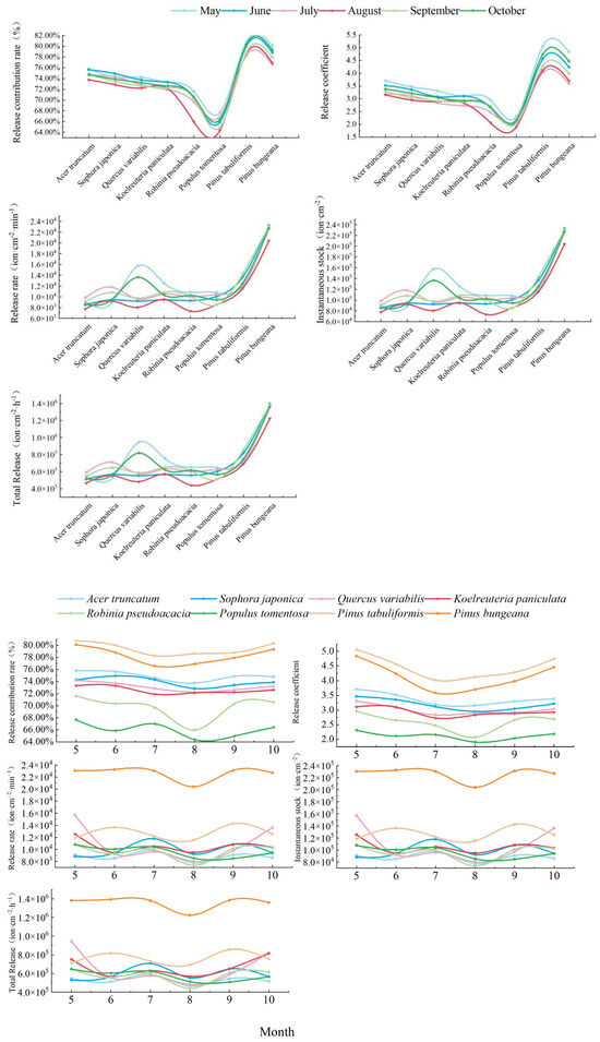 The release rate s of conifer species, the instantaneous existing stock v, and the total number Z showed the following patterns: September > June > October > July > May > August. The quickest rate of release occurred in September, and the instantaneous existing stock and the maximum number released hour−1 were as follows, respectively: Pinus tabuliformis (s: 1.43 × 103 ion· cm−2· min−1, v: 14.28 × 103 ion· cm−2, and Z: 85.70 × 103 ion·cm−2·h−1) and Pinus bungeana (s: 2.31 × 103 ion·cm−2·min−1, v: 23.10 × 103 ion·cm−2, and Z: 138.59 × 103 ion·cm−2·h−1). The slowest release rate occurred in August, and the instantaneous current stock and the total number released per hour were the lowest, respectively, as follows: Pinus tabuliformis (s: 1.16 × 103 ion·cm−2·min−1, v: 11.55 × 103 ion·cm−2, and Z: 69.30 × 103 ion·cm−2·h−1) and Pinus bungeana (s: 2.04 × 103 ion·cm−2·min−1, v: 20.40 × 103 ion·cm−2, and Z: 122.39 × 103 ion·cm−2·h−1). The s, v, and Z of the broadleaf trees showed characteristics as follows: July > May > September > October > June > August. The release rate in July was the quickest; the most instantaneous stock and the total number released hour−1; and the range in variation was s: 0.96 × 103~1.18 × 103 ion·cm−2·min−1, v: 9.60 × 103~11.80 × 103 ion·cm−2, and Z: 57.59 × 103~70.81 × 103 ion·cm−2·h−1.