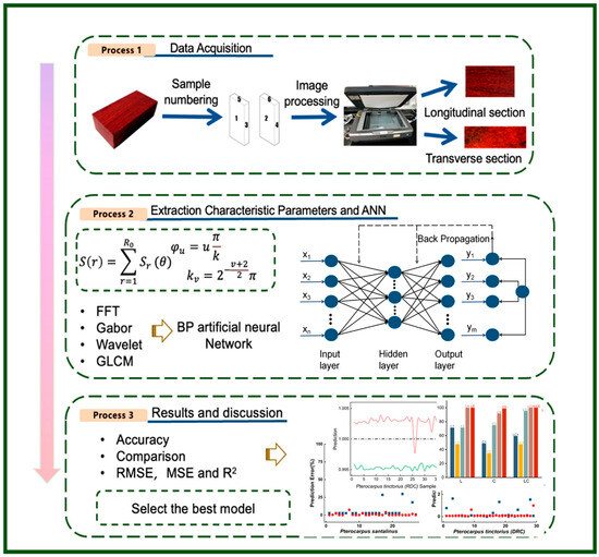 Given that effective feature extraction critically determines the success of image texture classification [16], four advanced algorithms—Fast Fourier Transformation (FFT) [17], Gabor Transform (Gabor) [18], Wavelet Transform (WT) [19], and Gray-Level Co-occurrence Matrix (GLCM) [20]—were utilized in this study [21] to extract feature parameters from dual-section (cross-sectional and longitudinal) images of Pterocarpus santalinus, Pterocarpus tinctorius (PTD), and Pterocarpus tinctorius (Zambia). The extracted features were then used as inputs for an artificial neural network (ANN) model, which was constructed based on different combinations of input parameters to facilitate training and the recognition of wood species. By comparing the R2, mean square error (MSE), and root mean square error (RMSE) to evaluate the performance of the training model, the most effective ANN configuration was determined, thereby confirming the feasibility of image-based techniques for accurately identifying valuable wood. The logical framework of the proposed method is shown in Figure 1, where data collection is carried out in process 1; feature extraction and model training are carried out in process 2; and analysis, evaluation, and result interpretation are carried out in process 3.