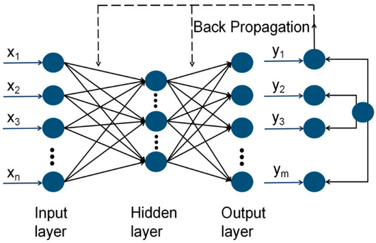 A back propagation (BP) artificial neural network (ANN) was used to build models in this study. The structure of it is shown in Figure 2, which utilizes the back propagation learning algorithm and operates as a feedforward neural network. It comprises an input layer, a hidden layer, and an output layer, with the hidden layer containing one or more nodes, also referred to as neurons.