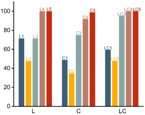 Accuracies of all the models trained by the four algorithms. In this chart, L, C, and LC, respectively, denote longitudinal section, transverse section, and hybrid section. The numbers 1, 2, 3, 4, and 5 correspond to FFT, Gabor, GLCM, WT, and the four-parameter combination.