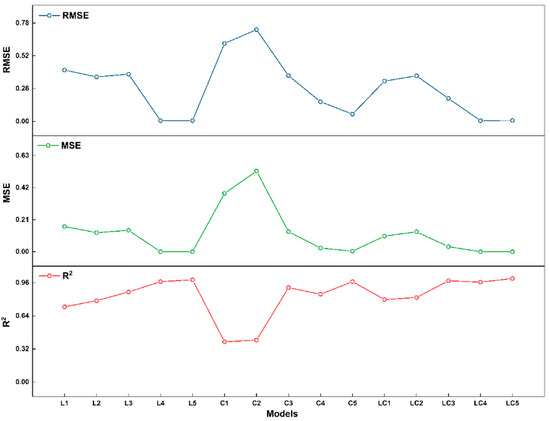 The fitting coefficient (R2), mean square error (MSE), and root mean square error (RMSE) of the models are shown in Figure 4, which are important metrics for evaluating the degree of fitting and error.