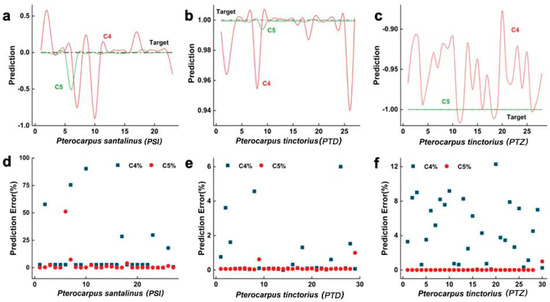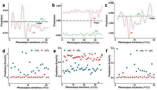 It is clearly shown in Figure 5 that, when the WT model (L4, C4, LC4) is used for training, the predicted values and their errors for the longitudinal sections of the three tree species are distributed within the 0~0.01 range, with sample errors concentrated in the [0%, 1.5%] range. In contrast, when the FPC model (L5, C5, LC5) is used, the predicted values and their errors are distributed within the 0.004~0.006 range, closer to the target values, with sample errors concentrated in the [0.4%, 0.54%] range. The FPC model’s longitudinal section has a lower error value, a stronger degree of fit, and improved overall performance. The poor information richness of the eight feature parameters that were retrieved from the longitudinal section describing the wood using the WT model is the reason for this. Conversely, there is enough information in the 18 feature parameters of the FPC model that describe the wood features for the model to find correlations between the feature parameters and wood grain for simpler identification.