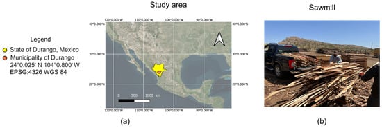 The study was conducted at a private sawmill located in the municipality of Durango, Mexico, a region with a temperate climate, average annual temperatures ranging from 16 to 20 °C, and precipitation between 500 and 800 mm [] (Figure 1a). The sawmill produces a variety of wood products, including boards, planks, and beams, in a wide range of dimensions. These products are obtained through mechanical wood processing under controlled conditions, ensuring compliance with technical quality standards. The resulting physical and dimensional properties make them suitable for both structural and non-structural applications, particularly in the fields of construction, carpentry, and manufacturing. During the sawing process, wood residues such as sawdust, bark, and offcuts are also generated (Figure 1b).
