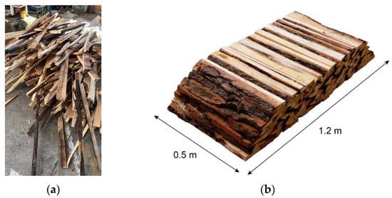 The residues utilized in this study, derived from Pinus spp., were generated during the primary sawing process using a main bandsaw. These materials, which are often discarded or incinerated without energy recovery, reflect common waste management practices in sawmills across the region (Figure 2a). To quantify the volume of these residues, twelve control piles were constructed, arranged in three groups of four piles each. The piles were trapezoidal in shape, with a uniform base length of 1.2 m and a width of 0.5 m. However, the height of the piles varied (Figure 2b).