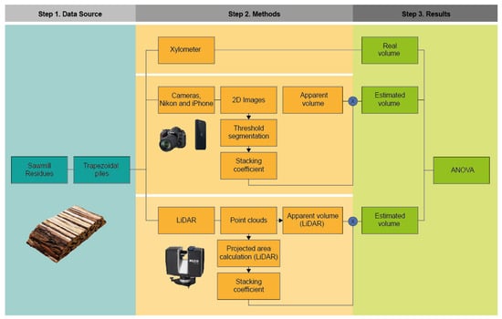 A workflow diagram (Figure 3) was developed to summarize the main stages involved in estimating the volume of sawmill residues using two indirect methods: 2D image analysis and LiDAR technology. The process begins with the arrangement of Pinus spp. residues in trapezoidal piles. The real volume is first determined using the xylometer method, which serves as a reference for validating the indirect estimations.