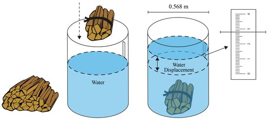 To determine the volume, a 220 L cylinder with a diameter of 0.568 m was used. An internal tape measure was attached to the cylinder to measure the displacement of water during immersion. The twelve piles were separated into samples that allowed immersion in the cylinder. The volume of the samples was calculated using Equation (1).