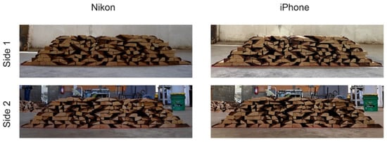 Images from two sides (front and rear faces) of the stacks were acquired with a Nikon HD digital SLR camera (Nikon, Tokyo, Japan) at a resolution of 6000 × 4000 pixels. Additional images were also captured with an iPhone SE 2022 (Apple Inc., Cupertino, CA, USA), which has a 12 MP wide-angle rear camera and ƒ/1.8 aperture (Figure 5). All images were captured under natural daylight to reduce potential lighting-induced bias and to ensure consistency across data. To reduce perspective distortion and optimize image resolution and feature detail, the camera was positioned perpendicular to the pile face, with the field of view adjusted to encompass the largest possible portion of the stack within the frame.
