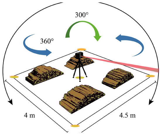To obtain a point cloud of the piles, a LiDAR scanner was positioned within a designated area of 4 × 4.5 m. Five scans were performed: four from each corner of the area and one from the center. This scanning arrangement was designed to capture a comprehensive dataset from multiple angles, ensuring an accurate representation of the pile dimensions and volume. The scanning angles were set to 300 degrees vertically and 360 degrees horizontally (Figure 7).