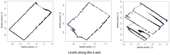 The areas of these sections were calculated using the Concaveman package [], which constructs a concave hull fitted to the distribution of points in each plane, ensuring accuracy in surface representation. The volume between consecutive levels was estimated by multiplying the calculated area by the height between the levels, and the total volume of each pile was obtained by summing the volumes of all sections. This procedure ensured accuracy in representing the surface of each section (Figure 8).