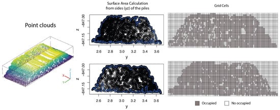 Subsequently, a gridded mesh with a resolution of 0.00001225 m2 was generated to cover the spatial boundary of the point cloud. Grid cells were classified as either occupied or empty based on their intersection with the point cloud. The adjusted area was calculated by multiplying the number of occupied cells by the area of each cell [,]. This process is illustrated in Figure 9.