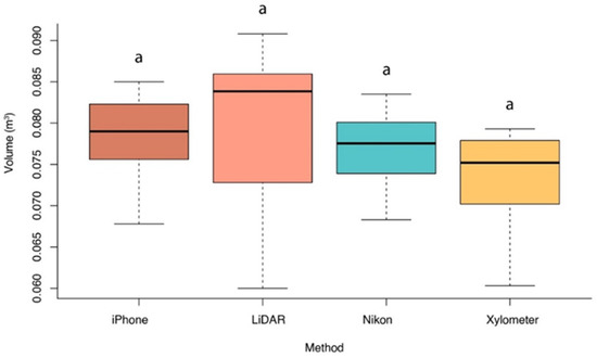 Box plot comparing volume estimates (m3) from iPhone, LiDAR, Nikon, and xylometer methods. The black lines represent medians, boxes indicate the interquartile range, and whiskers show data dispersion. Letters denote statistical groupings.