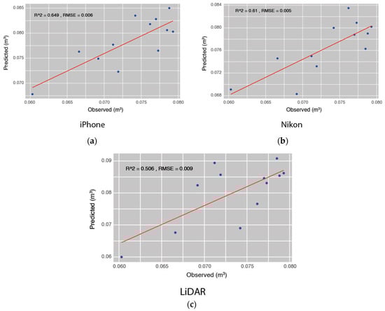 Comparison between observed volume values (measured with a xylometer) and predicted values from the (a) iPhone, (b) Nikon, and (c) LiDAR methods. Each panel includes the coefficient of determination (R2) and root mean square error (RMSE) as model performance metrics.