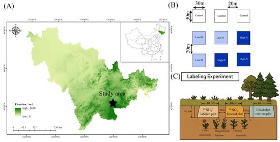 Experimental design for nitrogen addition and labeling in temperate forest. (A) Study site; (B) Plot setup; (C) Labeling experiment design.