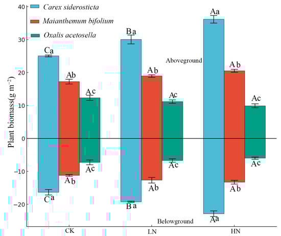 Plant biomass of three species under different nitrogen treatments. CK represents the control treatment, LN represents the Low-N (2.5 g N m−2 yr−1), and HN represents the High-N (5.0 g N m−2 yr−1). Different capital letters indicate significant differences among different treatments for the same species, while different lowercase letters denote statistically significant differences among different species under the same treatment. A significant difference is indicated when p < 0.05.