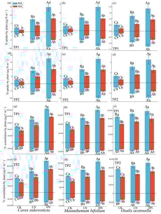 Nitrogen uptake (a–f) and 13C assimilation (g–l) in Carex siderosticta, Maianthemum bifolium, and Oxalis acetosella under three nitrogen treatments (CK, LN, HN) and two nitrogen forms (15NH4+ and 15NO3−) at two time points (TP1 and TP2). CK represents the control treatment, LN represents the Low-N (2.5 g N m−2 yr−1), HN represents the High-N (5.0 g N m−2 yr−1). Different capital letters indicate significant differences among different treatments for the same N form, while different lowercase letters denote statistically significant differences between different N forms under the same treatment. A significant difference is indicated when p < 0.05.