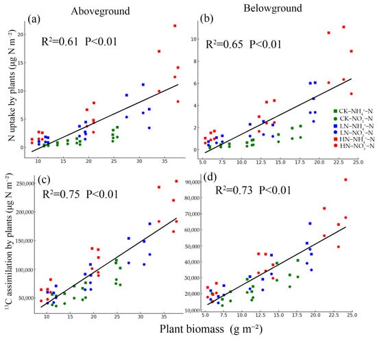 Correlation between above- and belowground plant biomass and uptake of N (a,b) or 13CO2 assimilation (c,d) by plants of three nitrogen treatments at TP2. CK represents the control treatment, LN represents the Low-N (2.5 g N m−2 yr−1), and HN represents the High-N (5.0 g N m−2 yr−1).