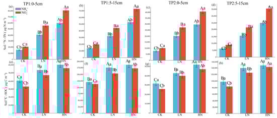 Soil 15N-TN (a–d) and 13C-SOC (e–h) content at different soil depths (0–5 cm, 5–15 cm) and time points (TP1 and TP2) under three nitrogen treatments (CK, LN, HN) and two nitrogen forms (15NH4+ and 15NO3−). CK represents the control treatment, LN represents the Low-N (2.5 g N m−2 yr−1), and HN represents the High-N (5.0 g N m−2 yr−1). Different capital letters indicate significant differences among nitrogen treatments for the same soil depth, while different lowercase letters denote significant differences between nitrogen forms within the same treatment. A significant difference is indicated when p < 0.05.
