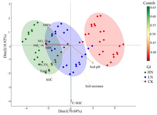 Principal component analysis (PCA) revealed that soil variables (NH4+-N, NO3−-N, MBN, MBC, soil moisture, soil pH, total N, 15N-TN, and 13C-SOC) exhibited clear clustering based on nitrogen treatment, soil depth, and time point (Figure 6). The HN treatment showed distinct clustering, particularly for 0–5 cm depth, with a strong positive contribution from MBN, NO3−-N, and 15N-TN. The LN and CK treatments had more overlap, but the HN treatment distinctly separated across both depths (0–5 cm and 5–15 cm) and time points (TP1 and TP2). These patterns highlight that nitrogen treatment, especially high nitrogen, has a significant influence on soil properties across time points and soil depths.