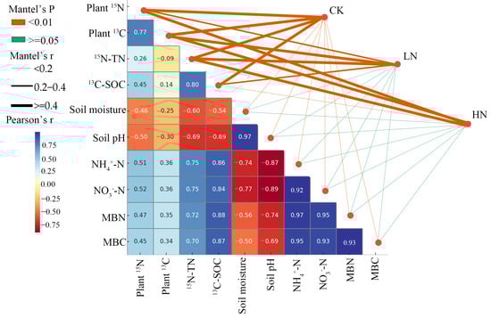 Correlation matrix showing Pearson’s r values for various soil and plant variables under three nitrogen treatments. Mantel’s r and p-values are also shown, with thicker orange lines indicating significant correlations (p < 0.01). Positive correlations are shown in blue and negative correlations in red, with the intensity of the color representing the strength of the correlation. Significant correlations between variables are indicated when Mantel’s p < 0.05. CK represents the control treatment, LN represents the Low-N (2.5 g N m−2 yr−1), and HN represents the High-N (5.0 g N m−2 yr−1).