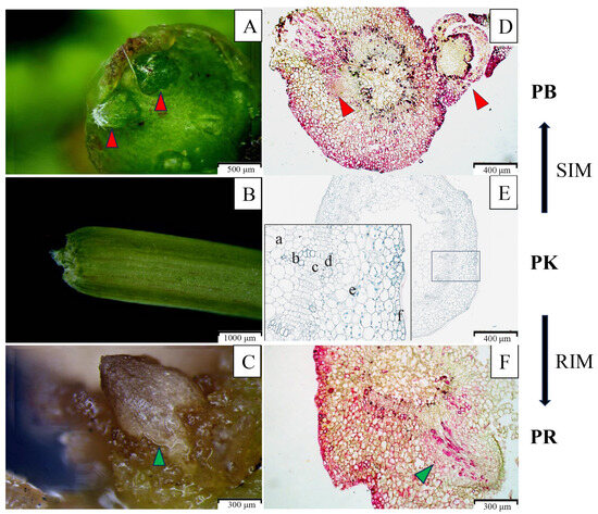 Differentiation of the young stems into adventitious buds and roots under different hormonal treatments. (A–C) Morphological observations of the basal stem segments of cultured young stems at different stages. (A) After 10 days of adventitious buds induction, protrusions of ABs appeared on the stem surface; (B) before induction, the stem surface was smooth; (C) after 13 days of adventitious roots induction, protrusions of ARs formed on the stem surface. (D–F) Anatomical observations of the basal stem segments of cultured young stems at different stages. (D) After 7 days of adventitious buds induction, initial bud organs appeared on the stem surface and there were meristem cell clusters in stem segments; (E) before induction, no buds or root primordia were observed. a, pith, b, xylem, c, vascular cambium. d, phloem. e, cortex. f, epidermis; (F) after 9 days of adventitious roots induction, root primordial cells continued to divide, and the root primordium elongated. PB: 7 days of ABs induction, PK: pre-induction, PR: 9 days of ARs induction, SIM: adventitious buds induction medium, RIM: adventitious roots induction medium. Red arrows indicate ABs and green arrows indicate ARs.