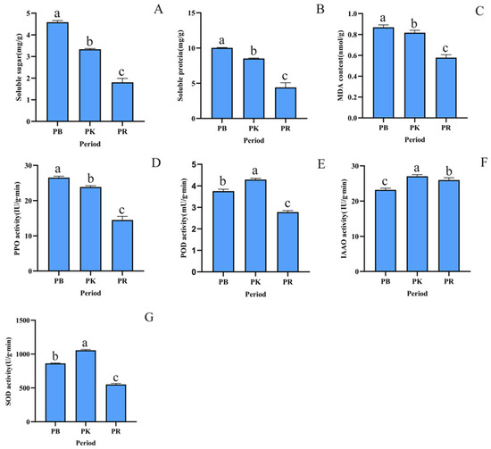 Changes in nutrient content and enzyme activity in morphogenesis of adventitious buds and roots. (A) Soluble sugar. (B) Soluble protein. (C) MDA. (D) PPO. (E) POD. (F) IAAO. (G) SOD. The data represent mean ± SD (n = 6). Different lowercase letters (a, b, and c) indicate significant differences in physiological indices between different samples at the 0.05 level based on one-way ANOVA and LSD multiple comparison. PB: 7 days of ABs induction in medium (MS + 2.0 mg/L 6-BA + 0.5 mg/L NAA); PK: pre-induction; PR: 9 days of ARs induction in medium (MS + 0.5 mg/L IBA + 0.5 mg/L NAA).