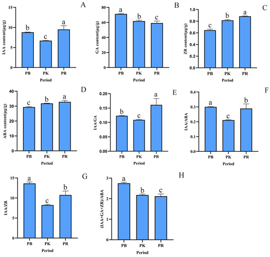 Changes in endogenous hormone levels in morphogenesis of two organs. (A) IAA. (B) GA. (C) ZR. (D) ABA. (E) IAA/GA. (F) IAA/ABA. (G) IAA/ZR. (H) (IAA + GA + ZR)/ABA. The data represent mean ± SD (n = 6). Different lowercase letters (a, b, and c) indicate significant differences in physiological indices between different samples at the 0.05 level based on one-way ANOVA and LSD multiple comparison. PB: 7 days of ABs induction in medium (MS + 2.0 mg/L 6-BA + 0.5 mg/L NAA); PK: pre-induction; PR: 9 days of ARs induction in medium (MS + 0.5 mg/L IBA + 0.5 mg/L NAA).
