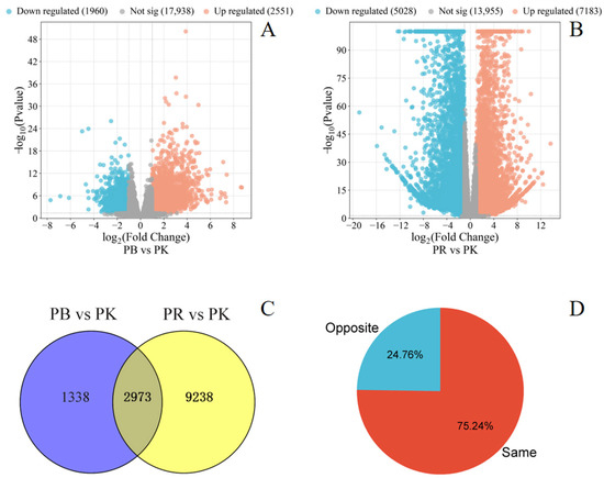 Analysis of differentially expressed genes in morphogenesis of adventitious buds and roots. (A,B) Volcano plots of differentially expressed genes. (A) PB vs. PK, adventitious buds induction process; (B) PR vs. PK, adventitious roots induction process. (C) Venn diagram of DEGs. (D) Pie chart showing the expression trends of common DEGs involved in both morphogenetic processes. Red indicates DEGs with the same expression trend in both processes, and blue indicates DEGs with opposite expression trends in both processes.
