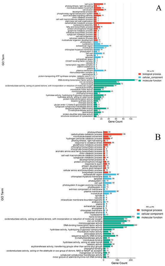 GO enrichment analysis of differentially expressed genes in morphogenesis of adventitious buds and roots. (A) GO enrichment of differentially expressed genes during adventitious buds formation. (B) GO enrichment of differentially expressed genes during adventitious roots formation.