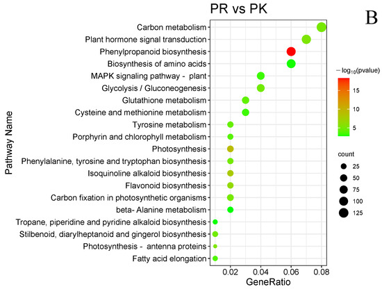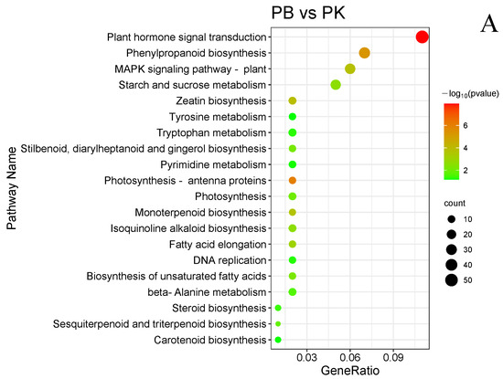To further understand the metabolic activities associated with the identified differentially expressed genes, KEGG annotation was performed, and the top 20 enriched pathways were selected for display (Figure 7). A total of 115 metabolic pathways were involved in adventitious buds and roots organ morphogenesis. Of these, 106 metabolic pathways participated in ABs formation, with plant hormone signal transduction, phenylpropanoid biosynthesis, MAPK signaling, and starch and sucrose metabolism pathways being the most enriched, containing 52, 34, 28, and 26 DEGs, respectively (Figure 7A). ARs formation involved 115 metabolic pathways, with carbon metabolism, plant hormone signal transduction, phenylpropanoid biosynthesis, and amino acid biosynthesis pathways being significantly enriched, with up to 100 DEGs involved (Figure 7B).