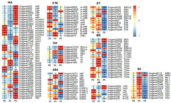 Heat map analysis of differentially expressed genes related to hormone signaling pathway in morphogenesis of adventitious buds and roots. Colored squares represent the average expression levels of DEGs across three biological replicates. Each row represents a gene, and each square represents a stage. Red indicates high expression, and blue indicates low expression. PB: adventitious buds formation; PK: pre-induction; PR: adventitious roots formation. Different lowercase letters (a, b, and c) indicate significant differences in physiological indices between different samples at the 0.05 level based on one-way ANOVA and LSD multiple comparison.