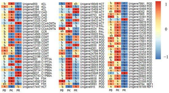 Heat map analysis of differentially expressed genes related to the phenylpropanoid biosynthesis pathway in morphogenesis of adventitious buds and roots. Colored squares represent the average expression levels of DEGs across three biological replicates. Each row represents a gene, and each square represents a stage. Red indicates high expression, and blue indicates low expression. PB: adventitious buds formation; PK: pre-induction; PR: adventitious roots formation. Different lowercase letters (a, b, and c) indicate significant differences in physiological indices between different samples at the 0.05 level based on one-way ANOVA and LSD multiple comparison.