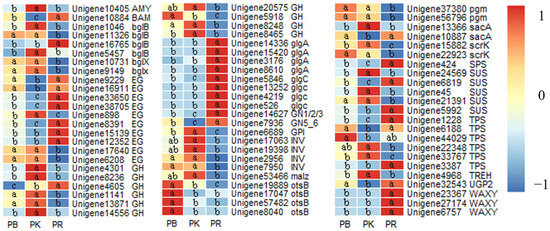 Heat map analysis of differentially expressed genes related to the starch and sugar metabolism pathway in morphogenesis of adventitious buds and roots. Colored squares represent the average expression levels of DEGs across three biological replicates. Each row represents a gene, and each square represents a stage. Red indicates high expression, and blue indicates low expression. PB: adventitious buds formation; PK: pre-induction; PR: adventitious roots formation. Different lowercase letters (a, b, and c) indicate significant differences in physiological indices between different samples at the 0.05 level based on one-way ANOVA and LSD multiple comparison.