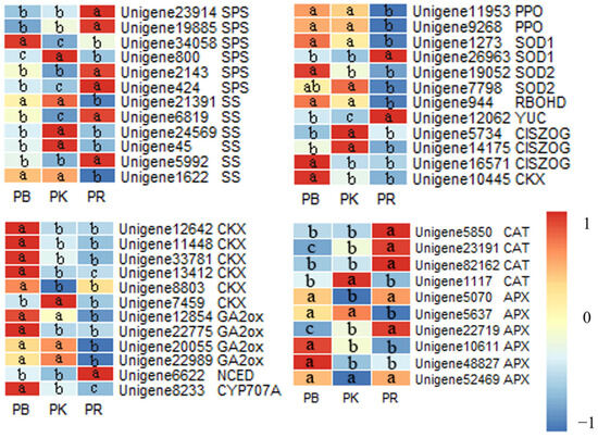 Heat map analysis of differentially expressed genes involved in nutrient metabolism, related enzymes, and hormone metabolism in morphogenesis of adventitious buds and roots. Colored squares represent the expression levels of genes. Each row represents a gene, and each square represents a stage. Red indicates high expression, and blue indicates low expression. PB: adventitious buds formation; PK: pre-induction; PR: adventitious roots formation. Different lowercase letters (a, b, and c) indicate significant differences in physiological indices between different samples at the 0.05 level based on one-way ANOVA and LSD multiple comparison.
