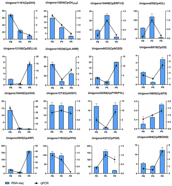 To verify the results of transcriptome sequencing, sixteen genes closely associated with the morphogenesis of adventitious buds and roots were selected from the DEGs for validation via qRT-PCR. These genes include CpGH3, CpGA2ox, CpSPS, and others. The expression trends observed were largely consistent with those identified by transcriptome sequencing, affirming the reliability of the RNA-seq results (Figure 12).
