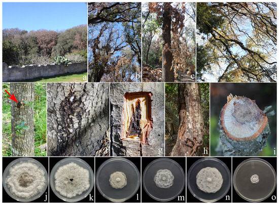 Major disease symptoms observed on holm oak trees and related pathogens associated: sudden death of mature trees (a); crown thinning, branch dieback, and abnormal growth of epicormic shoots along stems and branches (b–d); bleeding cankers on the stem (red arrow) (e); large bleeding canker with dark-brown exudation at the collar (f); inner bark and xylem necrotic lesions (g); particular of a sunken canker (h); cross section of a branch showing a characteristic V-shaped necrotic sector in the wood (i). Colony morphology of D. corticola (j), D. quercivora (k), P. asparagi (l), P. cinnamomi (m), P. multivora (n), and P. psychrophila (o) on PDA after seven days of incubation at 20 °C in the dark.