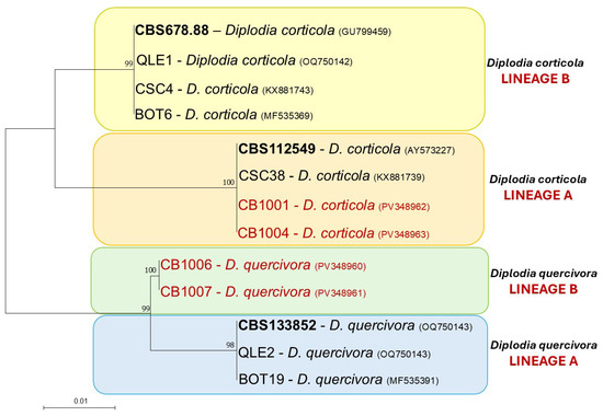 The amplicons were purified and sequenced with the same primers used for PCR at the Genewiz company (Germany). The raw sequence data were edited with BioEdit software v 7.0.9 and compared using BLASTN analysis in the NCBI database. The species was assigned when the nucleotide identity was more than 99.9% compared with sequences of ex-type culture deposited in GenBank. ITS, tef1-α, and MAT genes sequences of representative isolates of Diplodia corticola (isolate CB1001, accession numbers: PV299150, PV348962, PV348967; isolate CB1004: PV299151, PV348963, PV348968) D. quercivora (isolate CB1006, accession numbers: PV299152, PV348960, PV348965; isolate CB1007: PV299153, PV348961, PV348966), as well as ITS sequences of Phytophthora asparagi Saude & Hausbeck (isolate CB1015: PV299155), P. cinnamomi isolate CB1021 (PV299156), P. multivora P.M. Scott & T. Jung isolate CB1023 (PV299157), and P. psychrophila T. Jung & E.M. Hansen (isolate CB1020: PV299158) were deposited at GenBank.