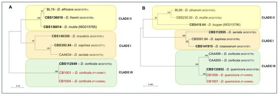 For each species, BLAST searches against GenBank showed 100% identity to reference ITS sequences of representative strains, including those of ex-type cultures. In the individual phylogenies based on tef1-α sequences, D. corticola isolates clustered within the Lineage A sensu [25,26] (Figure 2). Whereas the phylogeny of tef1-α sequences placed the two D. quercivora strains obtained in this study within a new lineage (haplotype), well supported and separated by 6 bp from the ex-type culture (Figure 2). Only isolates of the idiomorph MAT1-1 were detected for D. corticola, while for D. quercivora, only isolates of the MAT1-2 idiomorph were detected. Phylogenetic analyses based on MAT1-1 and MAT1-2 genes discriminate both species with high bootstrap support values (Figure 3).