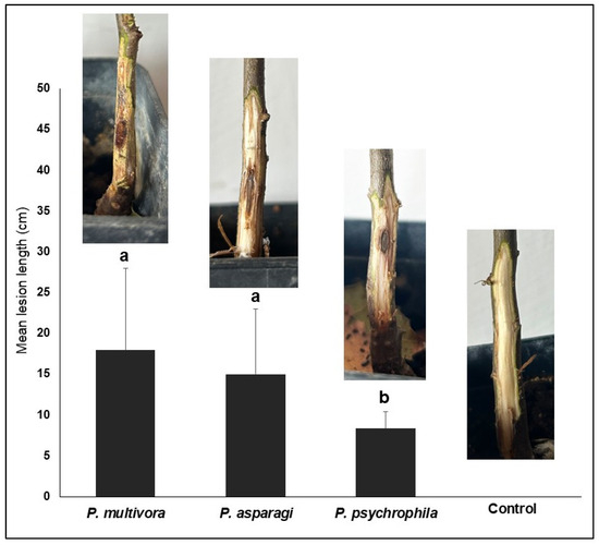 During April 2024, seven 1-year-old holm oak seedlings were inoculated at the stem with a representative isolate of each species. A further seven seedlings were inoculated with P. multivora for comparison. Inoculation was performed as reported in Linaldeddu et al. [16], and seedlings were maintained under control conditions at approximately 22 °C for 30 days at the UNIVPM screenhouse (Ancona, Italy). Seven controls were inoculated with a sterile PDA plug. At the end of the experimental period, inner bark necrotic lesions and external (wilting and exudates) disease symptoms were assessed. The size of the necrotic lesion was estimated by peeling off the outer bark. Finally, pathogen re-isolation was conducted by extracting five pieces of symptomatic inner bark tissue and placing them onto PDA+ medium. Pathogenicity assay data were checked for normality, then subjected to analysis of variance (ANOVA). Significant differences among mean values were determined using Fisher’s least significant differences multiple range test (α = 0.05) after one-way ANOVA using the software package XLSTAT® (Addinsoft Pearson Edition 2022, Paris, France).