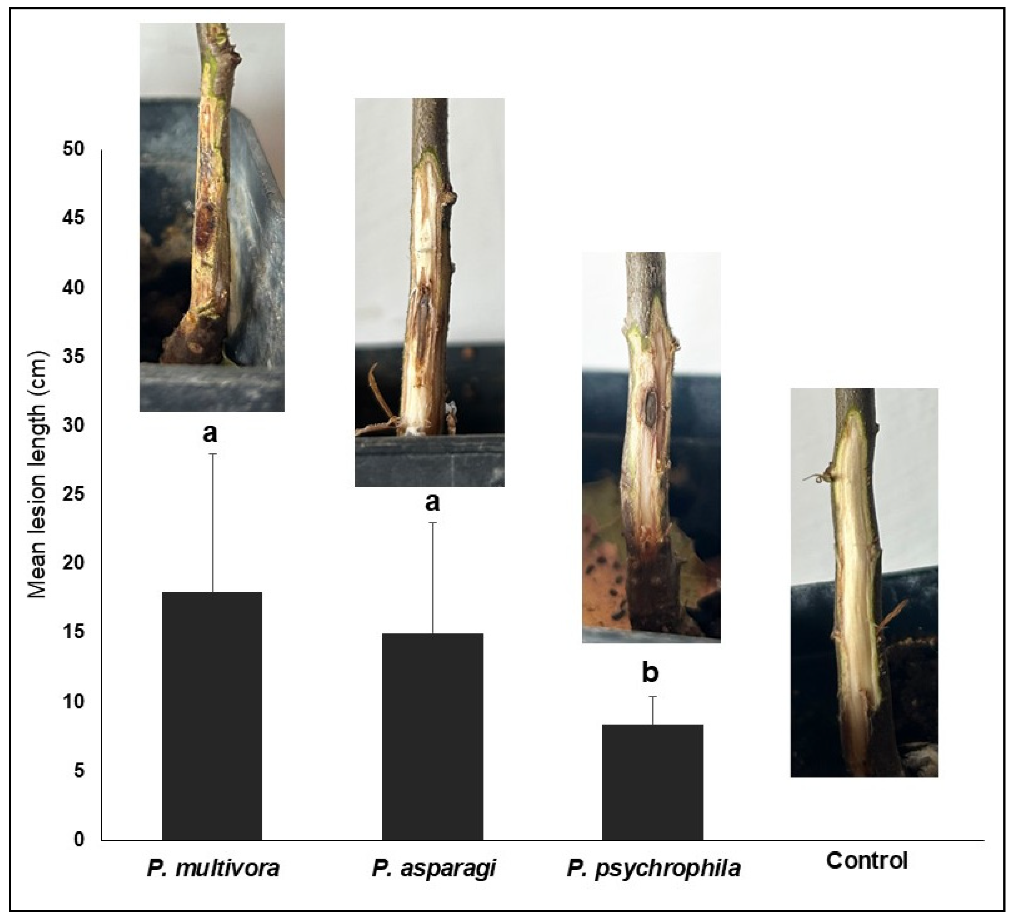 The three Phytophthora species showed a different degree of virulence on holm oak. The size of necrotic lesions ranges from 8.4 ± 2 mm for P. psychrophila to 18 ± 10 mm for P. multivora. Necrosis spread up and down the inner bark from the inoculation site. All Phytophthora species were successfully re-isolated from the margin of necrotic inner bark lesions of all seedlings, thus fulfilling Koch’s postulates (Figure 4). On control seedlings inoculated with sterile PDA plugs, the wound had healed without any disease symptoms.