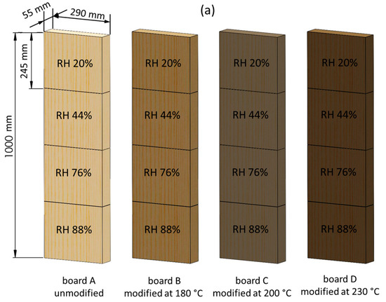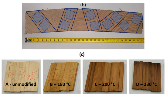 A spruce (Picea abies) board with the dimensions 4000 mm × 290 mm × 55 mm and a constant growth ring width was initially cut into four pieces of 1 m in length (Figure 1). The first piece was left untreated (group A), while the other three were thermally treated using the Silvapro method [47]. The second piece was treated at 180 °C (group B), the third at 200 °C (group C), and the last at 230 °C (group D), with mass losses of 1.8%, 4%, and 10.6%, respectively. The temperature range was chosen according to the usual temperature of thermal modification for spruce, which ranges from 180 °C to 230 °C [47]. After modification, all pieces were stored for six months at 22 °C and 65% relative humidity (RH) to allow the internal stresses to relax [47].