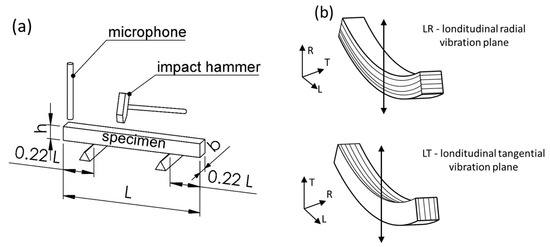 Wood is used in a variety of industries, from construction to the manufacturing of wooden musical instruments, where knowledge of the damping of wood is essential. The damping of wood has therefore been the subject of much research, investigating various effects on the extent of damping, both in construction [1] and in general research. For example, the influence of moisture and wood species on the extent of damping was investigated [2,3,4,5,6]. The authors found that damping increases with wood moisture content and decreases with the specific dynamic modulus (modulus of elasticity/density) [7,8]. Similarly, damping increases with an increasing vibration frequency, and the authors also found that damping increases with increasing shear influence during lateral vibrations [7,9]. Damping was also studied in wooden musical instruments [10,11,12,13], whereby in addition to damping, anatomical direction is also important, as mechanical properties are different in the radial direction than in the tangential direction.