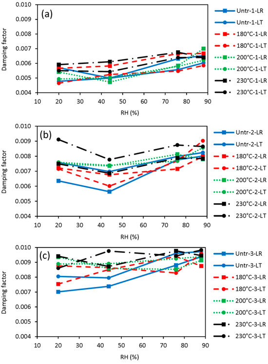 Damping factors of specimens exposed to different RHs, degrees of thermal modifications, vibration direction planes (LT and LR), and vibration modes. (a) First vibration mode; (b) second vibration mode; (c) third vibration mode.