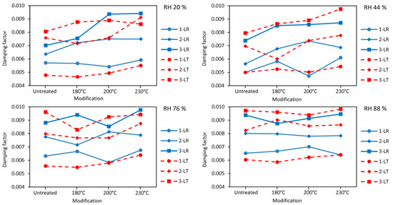 The results confirm that damping generally increases with RH, although there are some deviations from this trend in the mean values of RH. Similarly, damping generally increases with the degree of thermal modification, but the trend of increase varies with different values of RH, vibration modes, or frequency and vibration direction plane.
