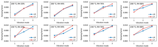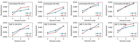 Figure 3 shows the damping factor at different RHs for all vibration modes and the degree of thermal modification. Damping generally increases with an increasing RH, initially decreasing slightly as the RH increases from 20% to 44% and then increasing at other RHs. The initial decrease is most pronounced for unmodified samples in all vibration modes and in the second vibration mode for both unmodified and modified samples. For the first vibration mode, damping is higher in the LR vibration direction plane for all samples, while for higher vibration modes, in general, damping in the LT vibration direction plane is higher than in the LR plane.