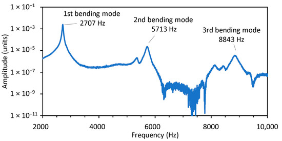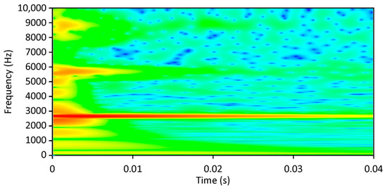 The WT scalogram, which also shows the vibration amplitudes, is shown in Figure 8. This scalogram shows the amplitudes of the vibrations for the first three bending modes particularly well, whereby the first bending mode at 2707 Hz has the largest vibration amplitude, which also vibrates the longest. The vibration for the second mode at the frequency of 5713 Hz has a significantly smaller vibration amplitude, and the vibration time is also significantly shorter, as the vibration of the second mode stops at around 0.015 s. The third bending vibration mode at the frequency of 8843 Hz has an even smaller vibration amplitude and time, which decays after only 0.01 s. In addition to these three main frequencies, which represent the bending vibration, the scalogram also shows other frequencies, like 5330 Hz, which have even smaller amplitudes and vibration times and most likely belong to torsional vibrations of the sample.