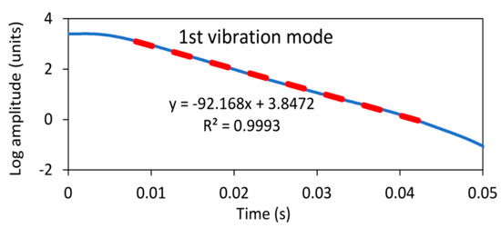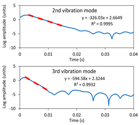 The amplitudes of the vibrations for the first three bending vibrations in a logarithmic scale are shown in Figure 9, together with the fit of the linear part from which damping was determined by the WT method, according to Equation (15).