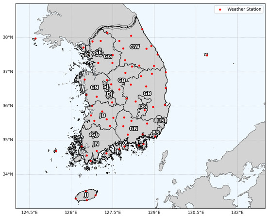Meteorological data were obtained from the Korea Meteorological Administration’s Automated Synoptic Observing System (ASOS), which provided hourly records of the temperature, relative humidity, wind speed, and precipitation at 73 stations from 2003 to 2023 (Figure 1).