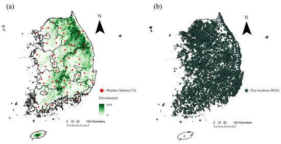 Spatial context for wildfire danger analysis in South Korea. (a) Digital elevation model (DEM); (b) spatial distribution of 9016 recorded wildfire ignition points in South Korea from 2004 to 2023.
